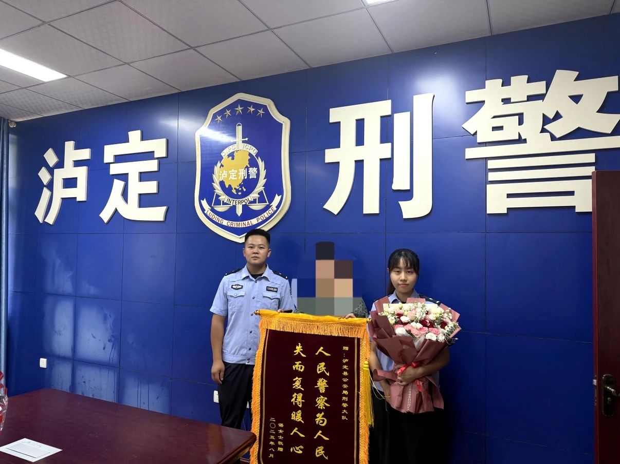 近日,泸定县居民谌女士(化名)将一面印有“人民警察为人民 失而复得暖人心”的锦旗送至泸定县公安局刑警大队,对民警迅速行动、全力追回其被骗22万元养老钱表示衷心感谢。